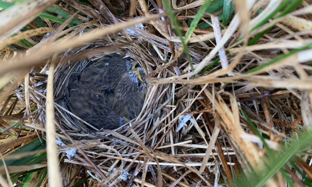 The photo below shows three mātātā South Island fernbird chicks safe in their nest on 13 September. They were being monitored by Forest & Bird’s Tautuku restoration project staff and were on the cusp of fledging.