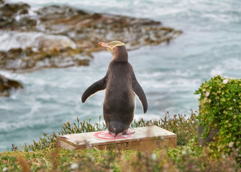 Hoiho standing on predator trap box. Image Jeremy Sanson